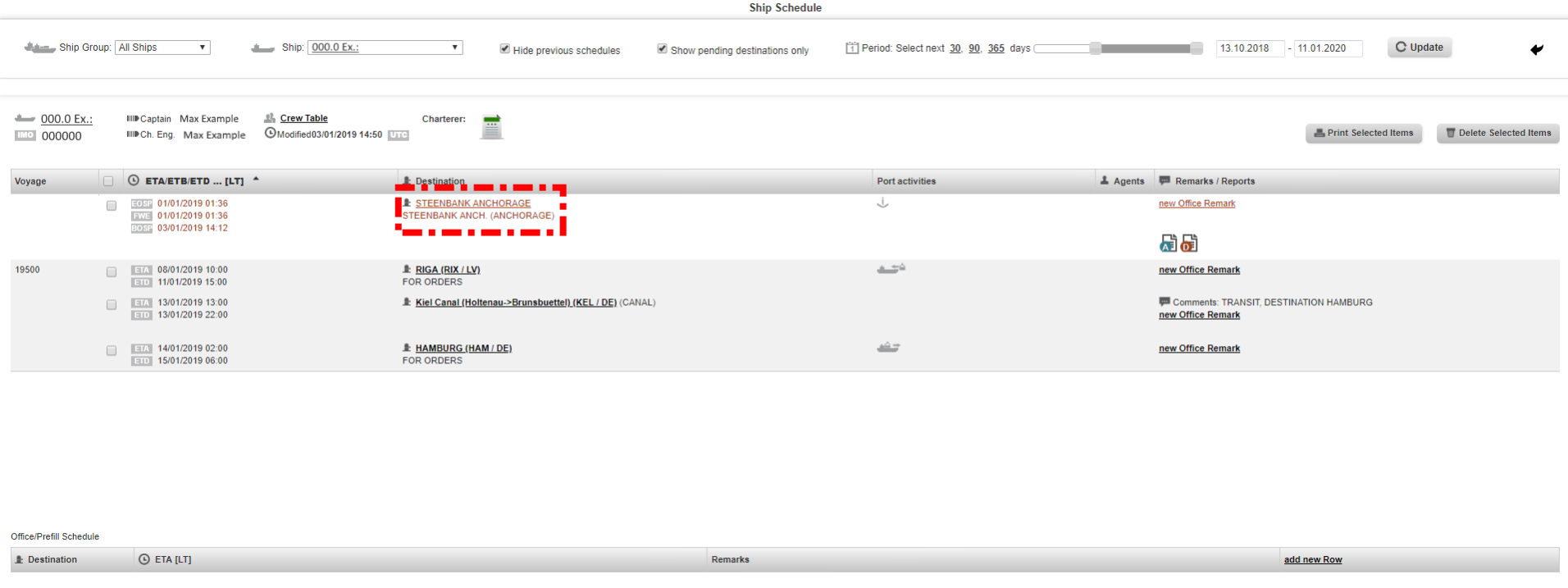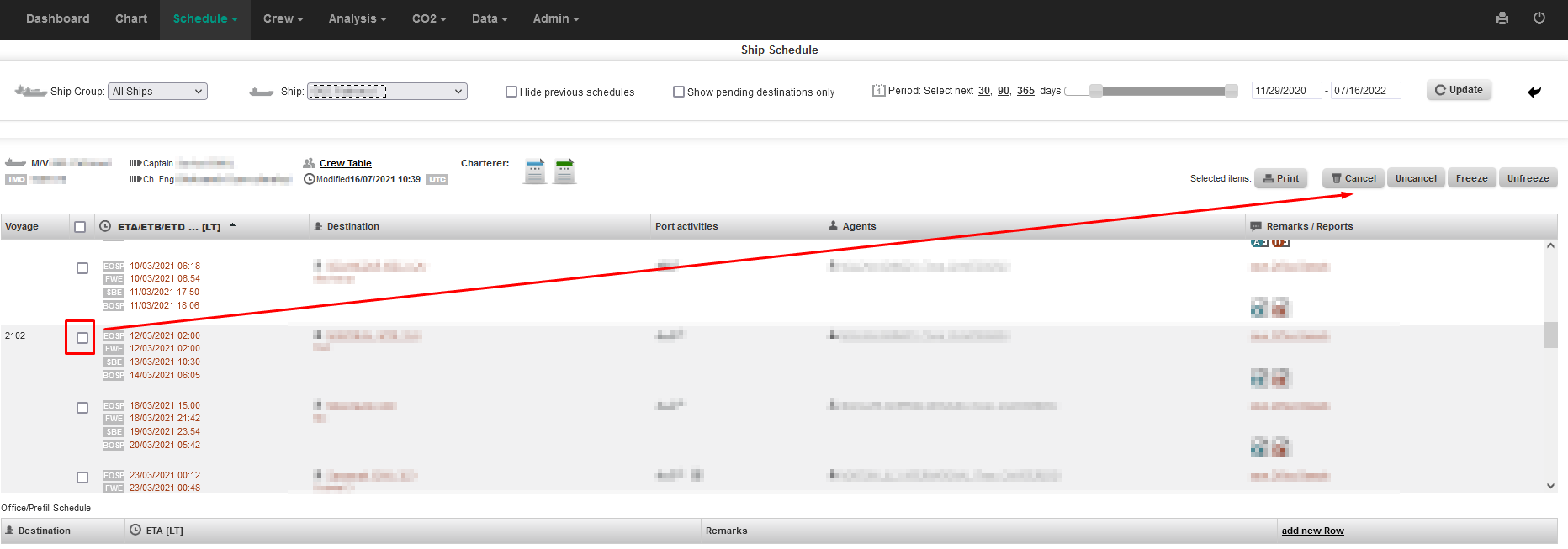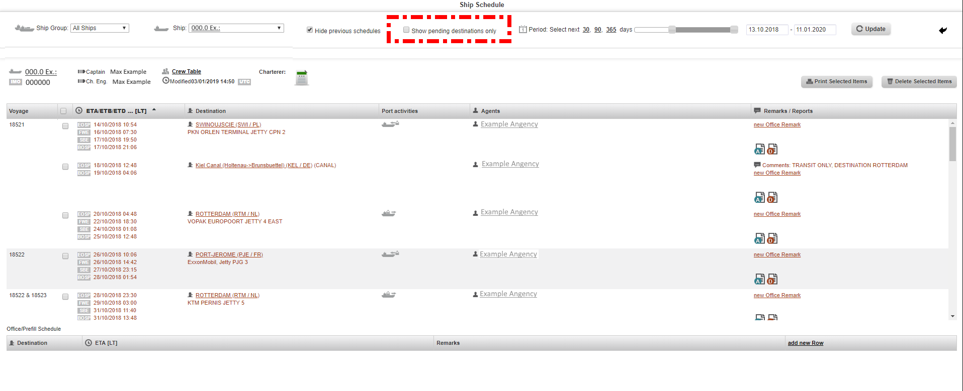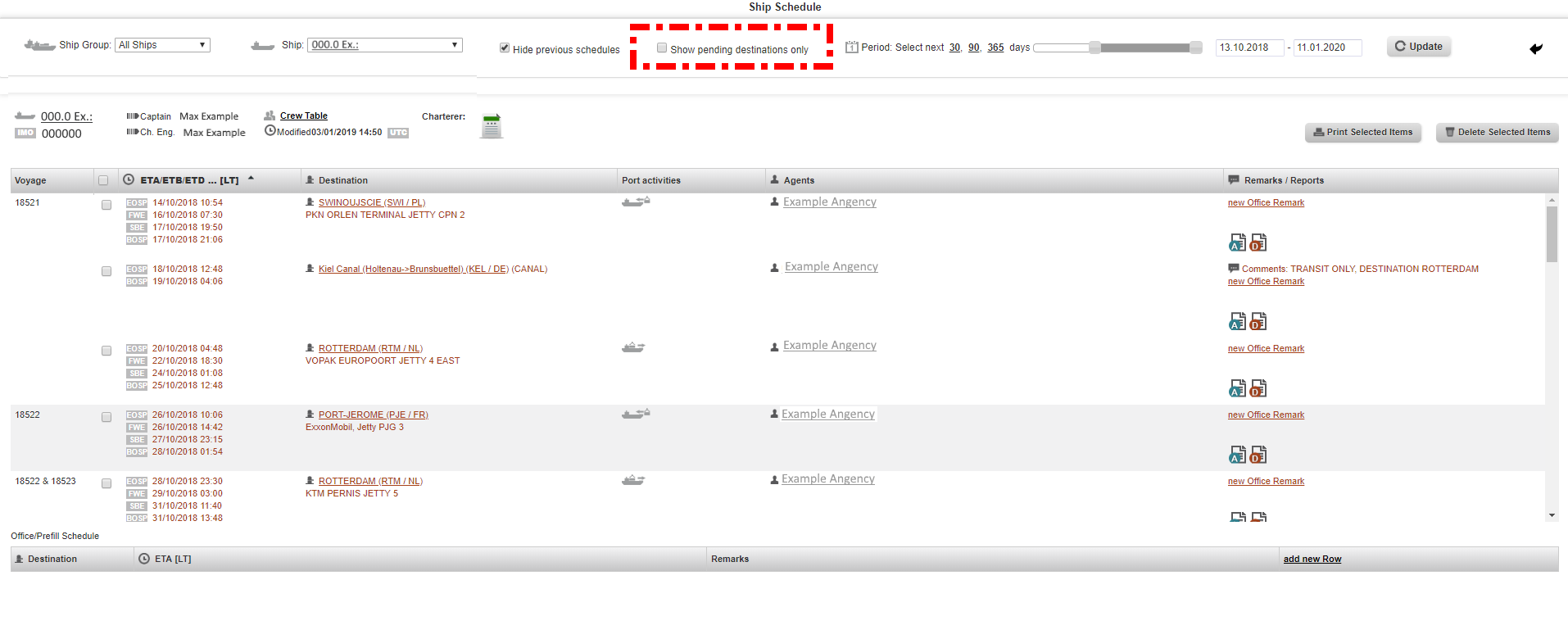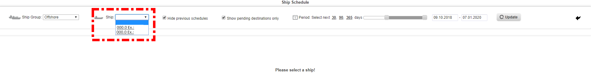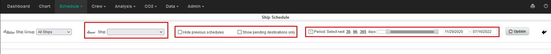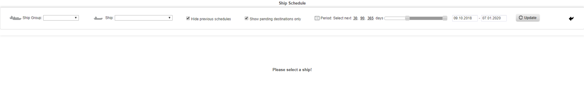 2. Select the vessel, untick the boxes "hhide previous schedules" and "Show pending destinations only", than choose the period as appropriate and click on the "Update" button.