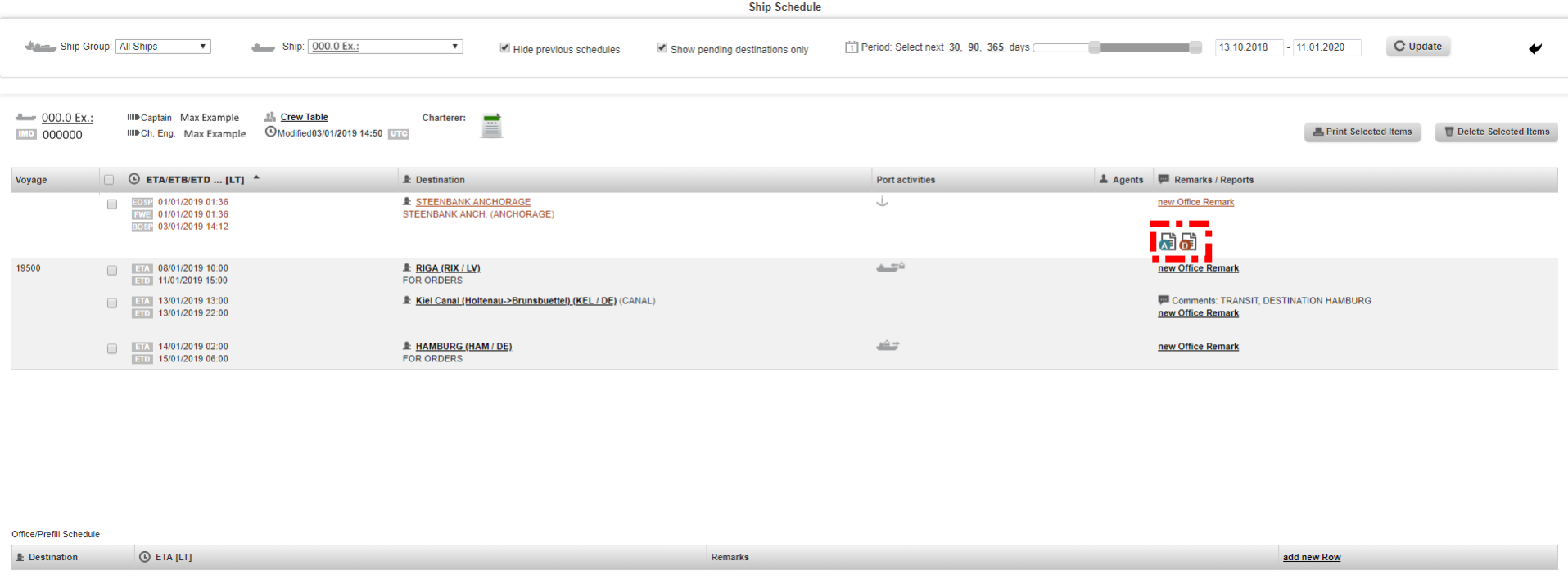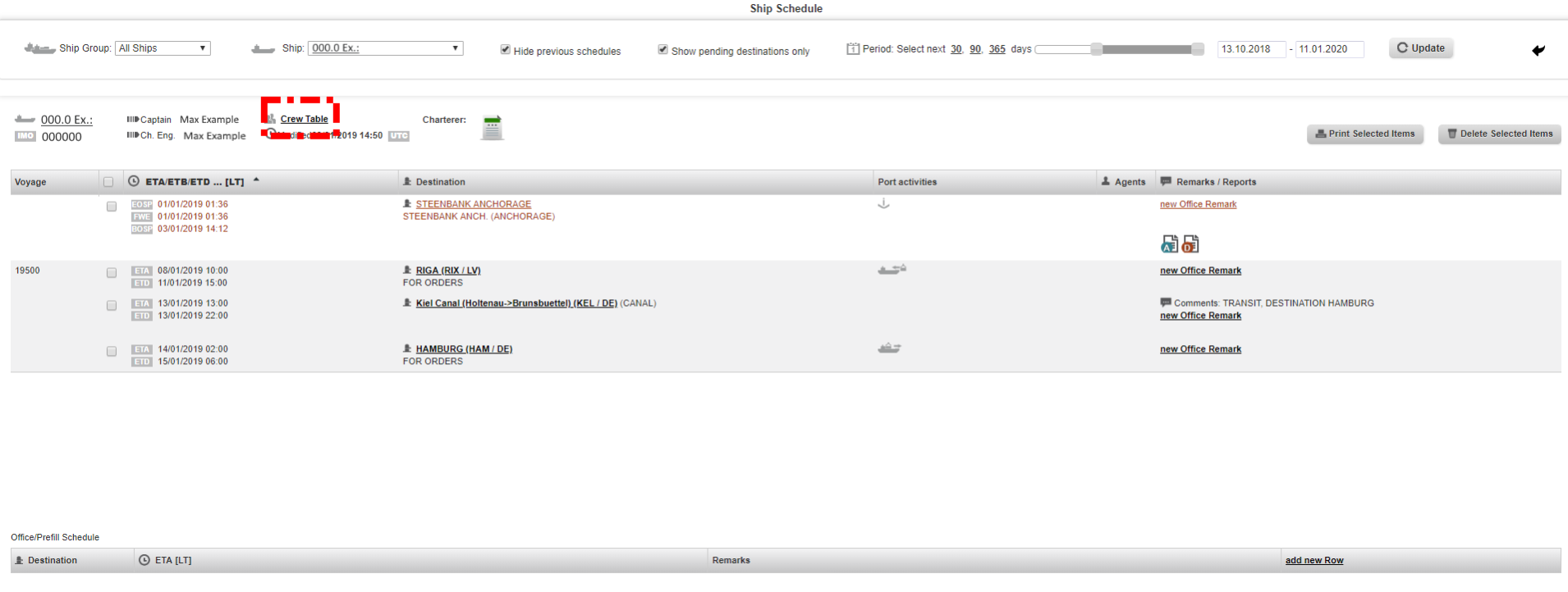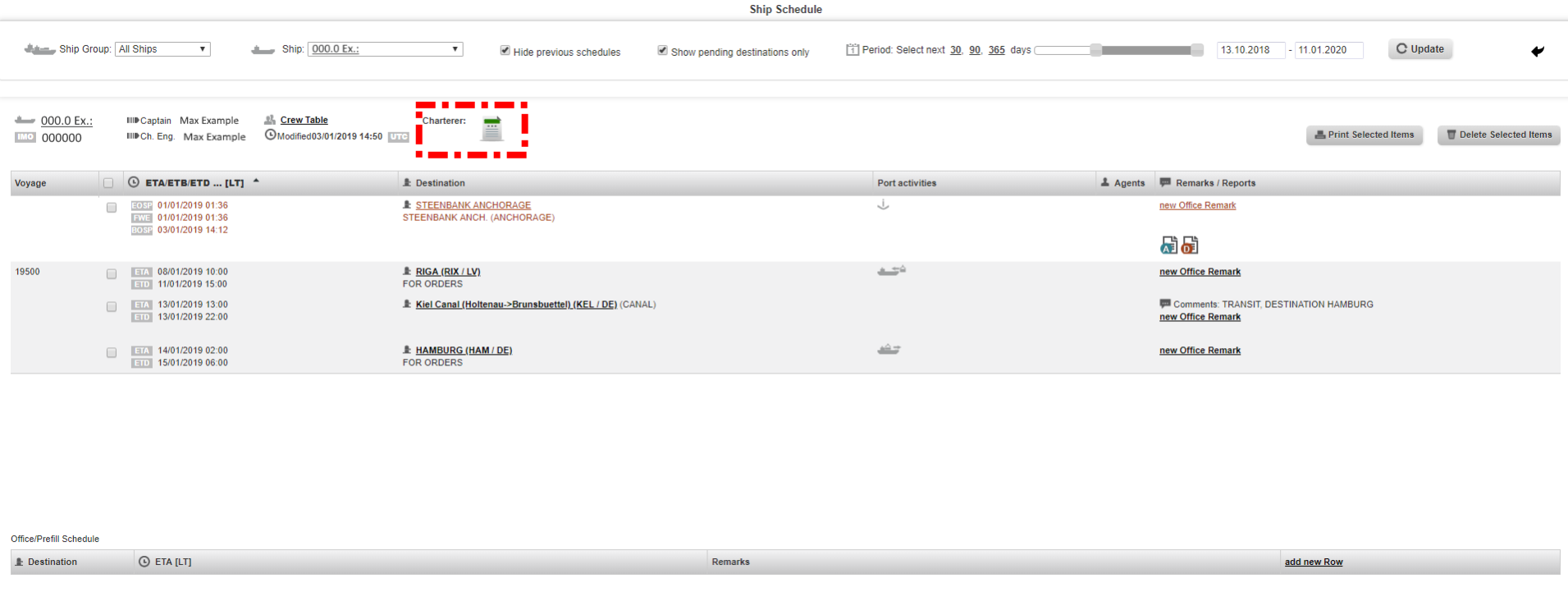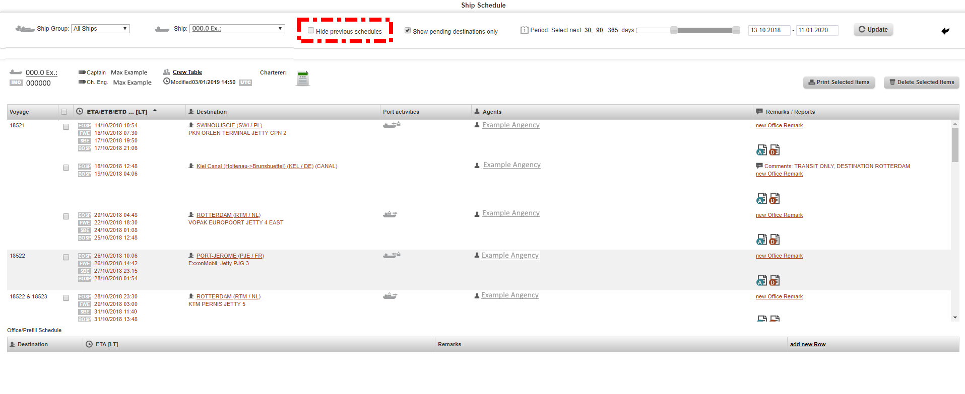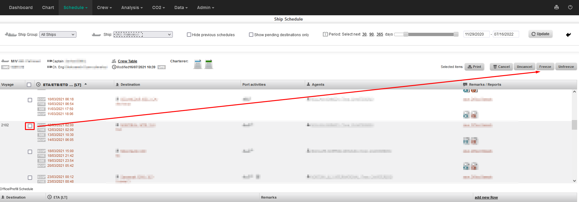 2. Select the vessel, untick the boxes "hhide previous schedules" and "Show pending destinations only", than choose the period as appropriate and click on the "Update" button.