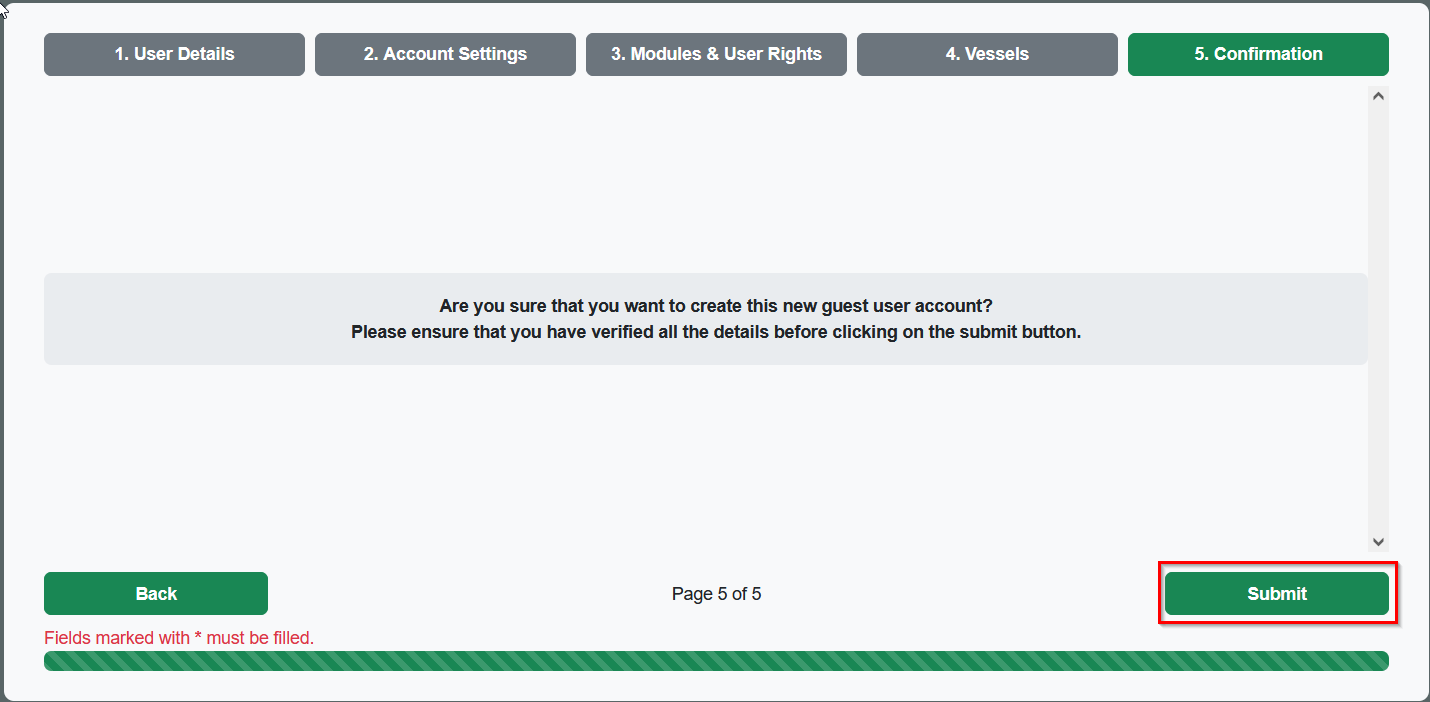 6. Step 5: Last but not least, you need to confirm that you want to add the new guest user account that you just configured. You can do that by clicking on the "submit" button. A new user will be created and an e-mail will be sent to that user to provide the login credentials for Fleettracker.