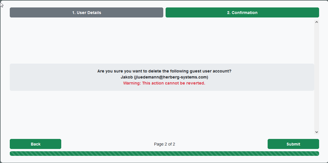 3. When clicking on the "Delete" button, a "Delete user" wizard will open. Please take a moment to verify that you have selected the correct guest user account for deletion. Once you're sure that you have selected the correct guest user account, then click on the "Submit" button to submit the deletion request.